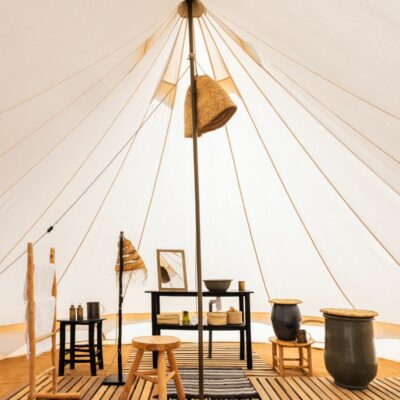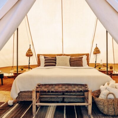 Chambre spacieuse, literie de rêve et coin salon chaleureux dans une tente, salle de bain décorée de poteries délicates dans une autre : le confort est optimal au beau milieu du désert et l’on en profite d’autant que le campement, éphémère par nature, se dresse seulement quelques mois par an dans ce site sublime. D’octobre à avril, les voyageurs peuvent faire halte dans cette oasis exclusive. De jour, ils font du yoga, se baladent en fat bike ou à dos de dromadaire dans les dunes, ils rendent visite à des bédouins ou partent faire du canyoning à Hawir Falls. La nuit, ils se font masser dans leur tente et dinent à la lueur des bougies et des lampes à l’huile avant d’observer les étoiles avec un télescope. Absolument magique !