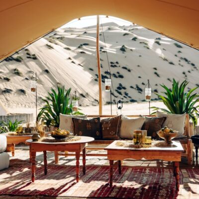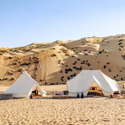Lové dans les replis des dunes dorées d’Oman, le Magic Camp Wahiba Sands évoque un campement luxueux de bédoins qui auraient fait fortune dans le commerce de la soie, des épices et des tapis tissés à la main. Ici, le raffinement est venu à la rencontre de la nature… Chaque tente blanche, élégamment meublée dans un style traditionnel, avec un mobilier soigné, des tapisseries et textiles raffinés, s’ouvre sur une terrasse d’où l’on peut admirer le lever et le coucher de soleil sur un paysage à couper le souffle.