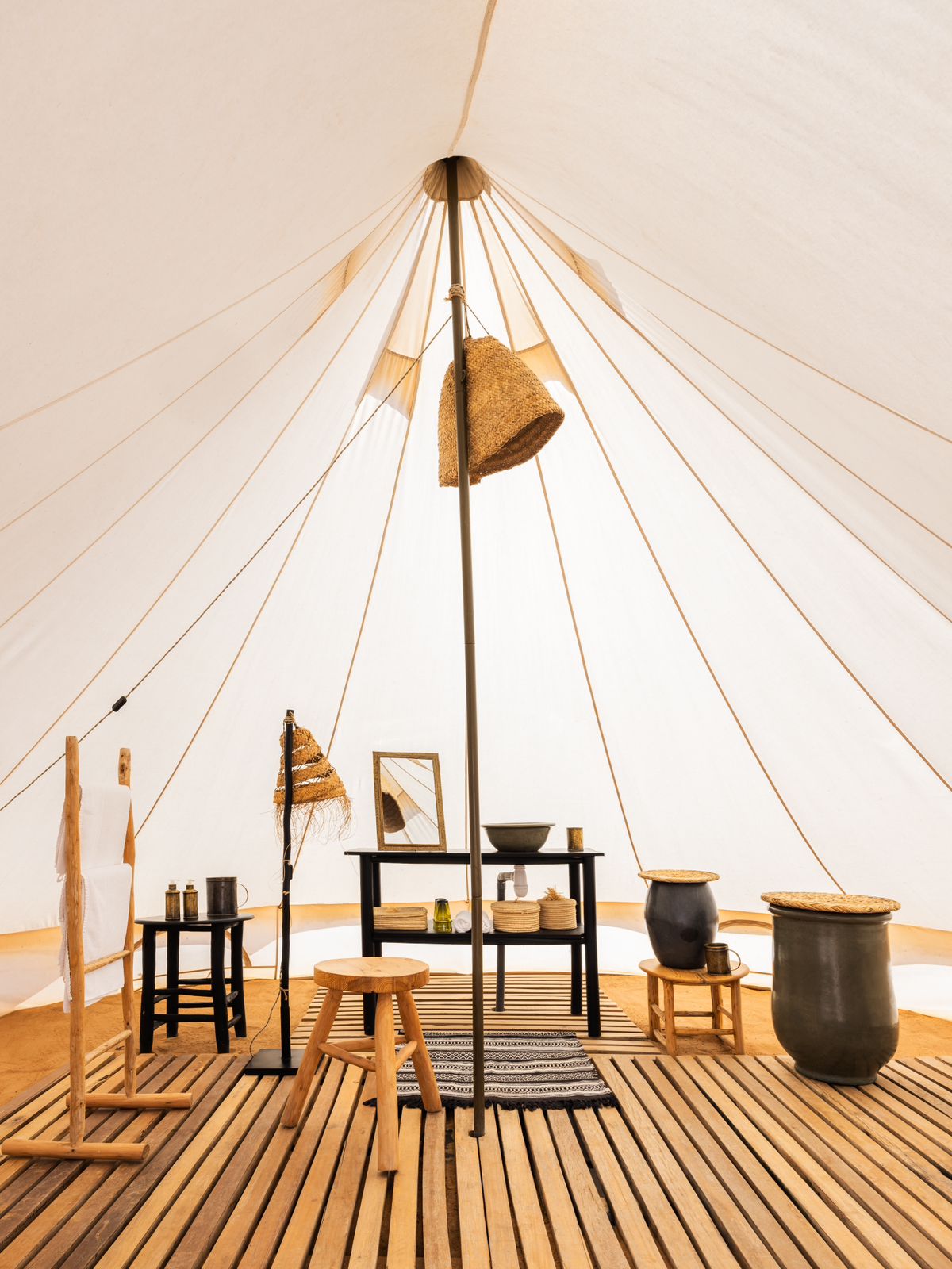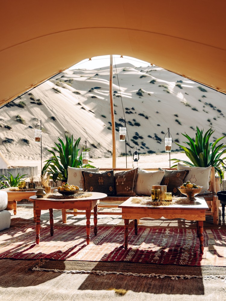 Chambre spacieuse, literie de rêve et coin salon chaleureux dans une tente, salle de bain décorée de poteries délicates dans une autre : le confort est optimal au beau milieu du désert et l’on en profite d’autant que le campement, éphémère par nature, se dresse seulement quelques mois par an dans ce site sublime. D’octobre à avril, les voyageurs peuvent faire halte dans cette oasis exclusive. De jour, ils font du yoga, se baladent en fat bike ou à dos de dromadaire dans les dunes, ils rendent visite à des bédouins ou partent faire du canyoning à Hawir Falls. La nuit, ils se font masser dans leur tente et dinent à la lueur des bougies et des lampes à l’huile avant d’observer les étoiles avec un télescope. Absolument magique !