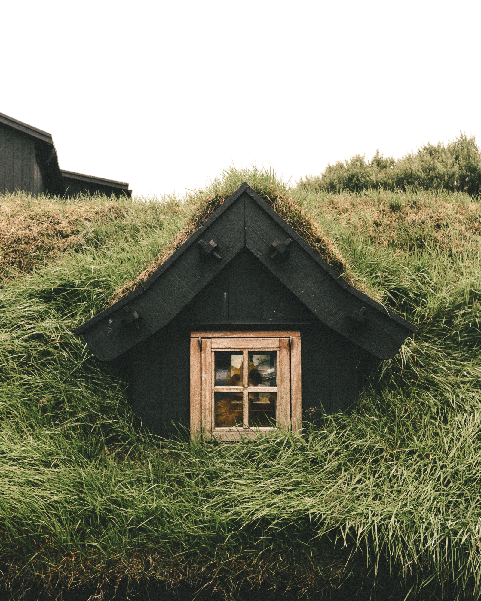 Le toit d'une maison, recouvert par de l'herbe verte, dans les îles Féroé