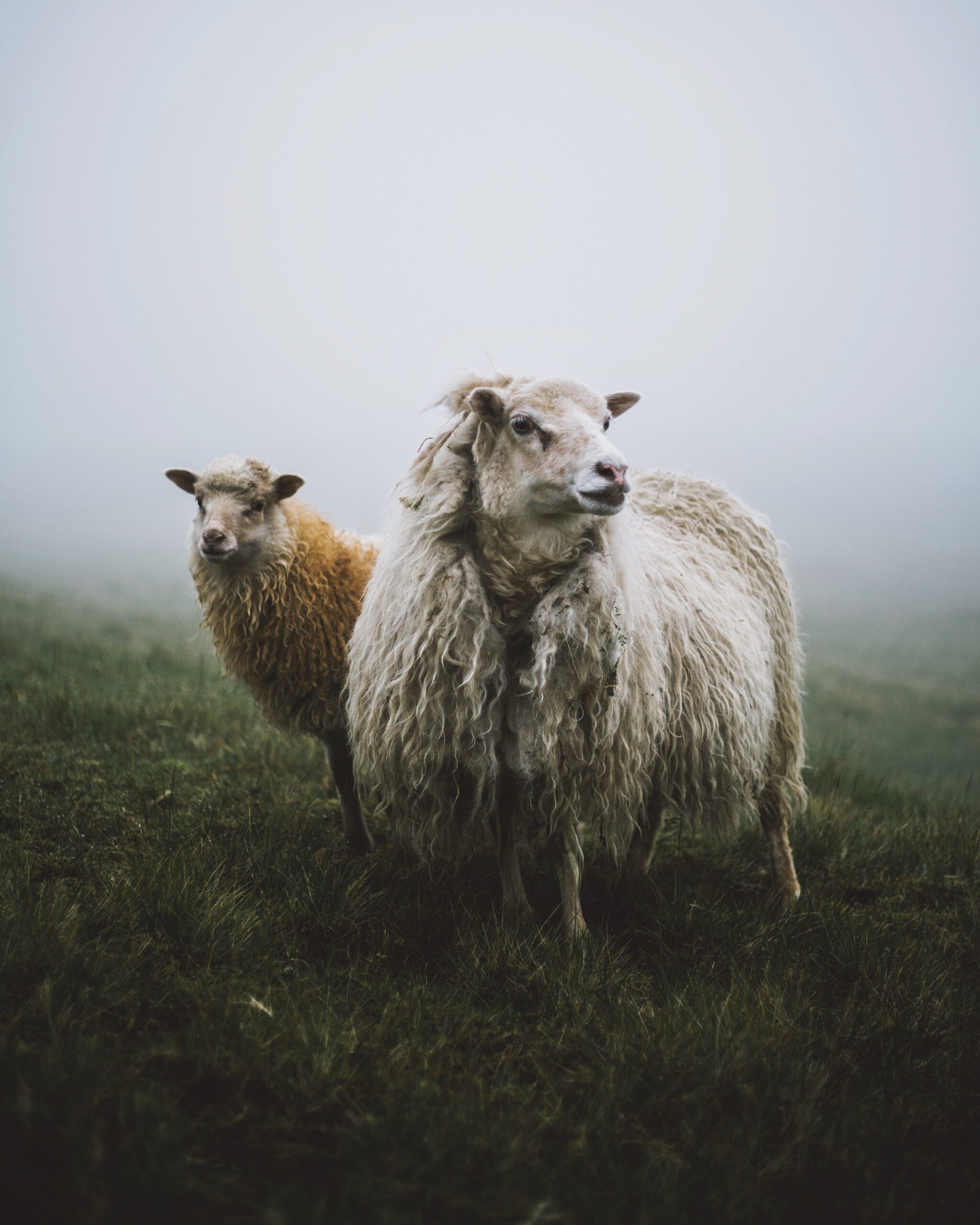Deux moutons dans la brume des îles Féroé, au Danemark