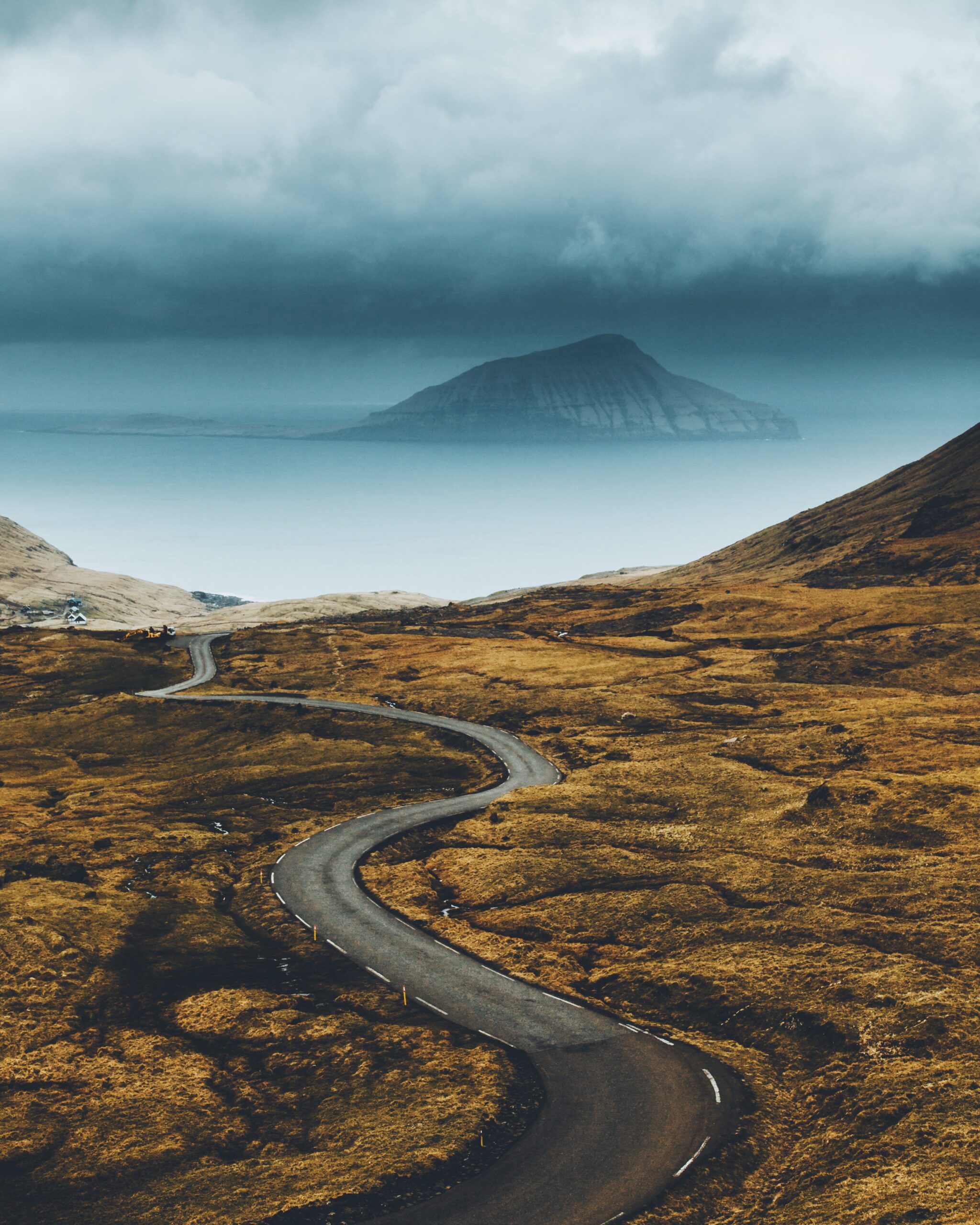 Une route qui serpente vers des falaises et la mer, dans les landes sauvages des îles Féroé