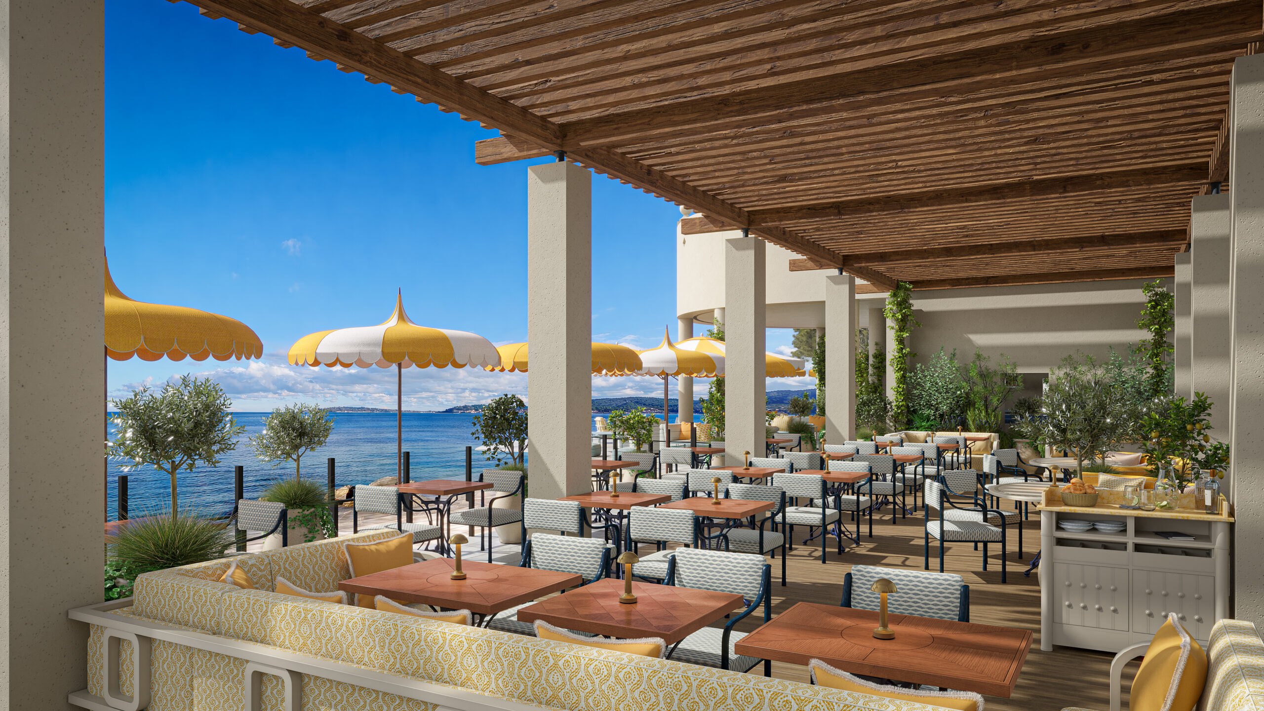 Car pour sa renaissance, COMO et Yannick Alléno ont confié une partie de la rénovation à Dorothée Delaye, une architecte qui sait cultiver l’art du contraste entre patrimoine et modernité. Cette dernière a réinterprété tous les codes de la Belle Epoque, caractérisée par les colonnes épurées, le fer forgé et la marqueterie de bois nobles, tout en ajoutant des jaunes solaires et des jacquards bleu azur. Une identité visuelle en parfaite harmonie avec la vision culinaire de Yannick Alléno, figure incontournable de la cuisine française à l’international. Éternel voyageur, le chef a choisi de proposer une collection d’expériences distinctes tout en étant complémentaires, pour enchanter les convives de l’aube jusqu’au soir.
