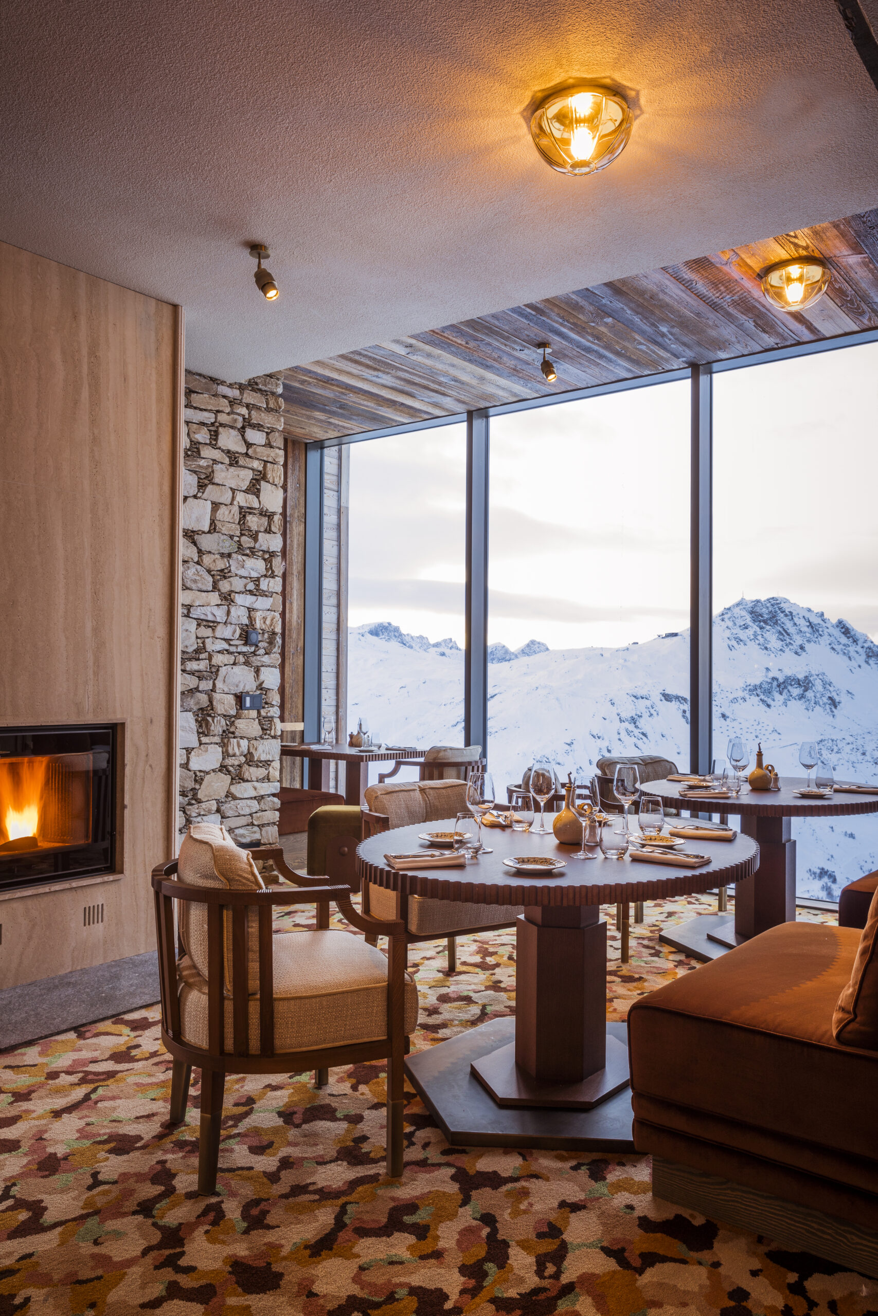C’est au refuge de Solaise, une ancienne gare de téléphérique reconvertie en hôtel de luxe (l’un des plus beaux hôtels des Alpes cela dit en passant), que notre fantasque dandy Milanais a choisi de s’installer. Dans ce belvédère planté à flanc de crête, à 2 550 mètres d’altitude, Gigi propose le meilleur de la gastronomie italienne dans un espace chaleureux influencé par l’élégance mutine des années 70. Cette décoration enveloppante, le restaurant la doit à Hugo Toto qui a privilégié les couleurs chaudes, le velours et le bois sculpté. Un décor chaleureux qui s’accorde parfaitement à la personnalité du maître des lieux avec, clin d’œil discret aux terres natales de Gigi, des citrons sculptés sur les bas-reliefs.