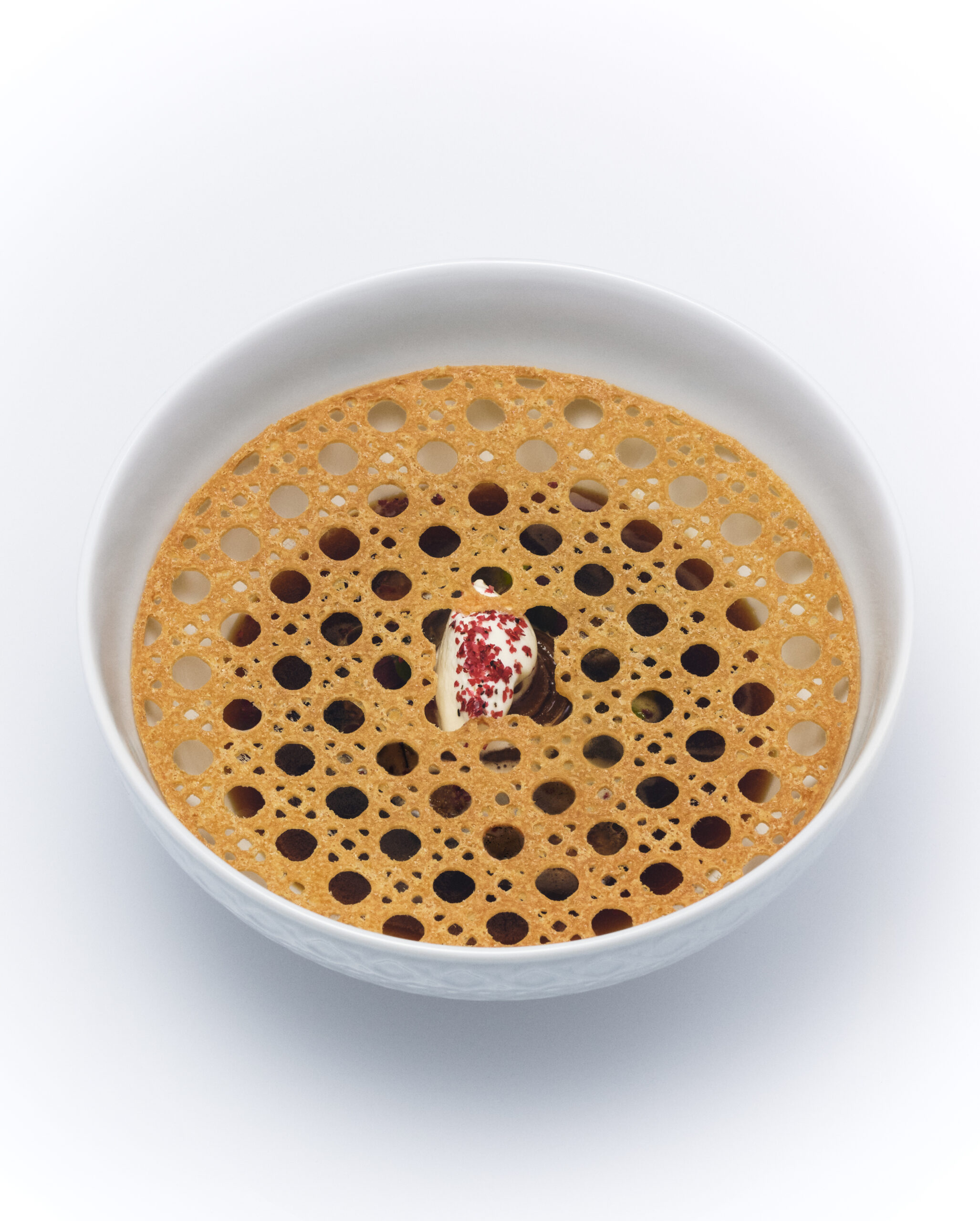 « Quelle joie de poursuivre cette complicité́ avec Dior ! » s’extasie Anne-Sophie Pic. « Mon exploration dans les archives de la Maison tout comme l’épicurisme de Christian Dior m’ont guidée pour la création d’une proposition culinaire élégante et gourmande autour de l’ovale ». Fascinée par l’univers raffiné du styliste qui révolutionna la mode d’après-guerre, la cheffe étoilée a imaginé des douceurs sucrées et salées qui reflètent l’héritage et l’identité de la marque. On retrouve donc l’iconique forme ovale inspirée par les courbes des fameuses chaises médaillon du 30 avenue Montaigne, le cannage signature au nœud haute-couture, le motif léopard ou l’inoubliable robe Junon, chef d’œuvre brodé de pétales bleu-vert…