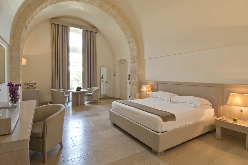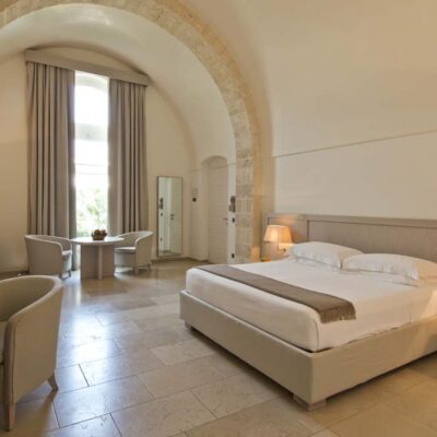Le Relais Histò San Pietro abrite aujourd’hui 48 chambres, dont 15 suites, pensées comme des refuges d’une incroyable sérénité. Leur design contemporain, adouci par la blondeur des teintes, dialogue avec la pierre millénaire de cet écrin historique. Les lignes sont épurées, les volumes spacieux, l’atmosphère raffinée. Certaines chambres sommeillent sous de superbes voûtes anciennes, d’autres s’ouvrent sur un balcon intime. Les suites spacieuses et baignées par la lumière dorée des Pouilles se composent souvent de deux pièces distinctes, offrant des ambiances variées selon leur emplacement. Pièce maîtresse, la Suite Mar Piccolo dispose d’une grande terrasse avec vue sur le bleu de la lagune et le vert des jardins. Ses baies vitrées inondent l’espace de lumière, révélant un vaste salon confortablement aménagé.