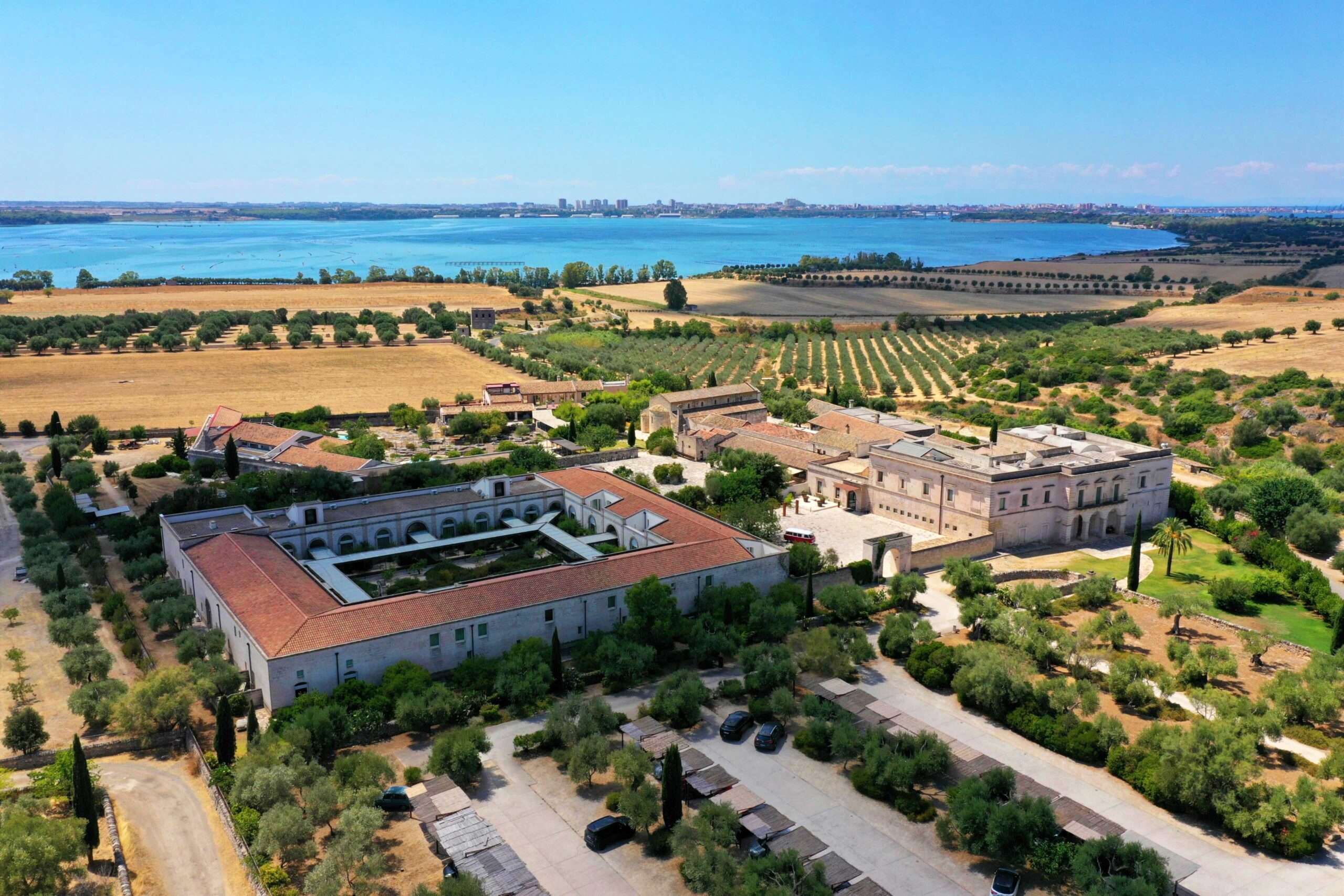 L’amour peut parfois faire des miracles… Giovanni Colomba a entrepris des travaux titanesques et même déterré les vestiges d’un aqueduc antique, témoins émouvants de l’ingéniosité romaine. Autrefois tombée en ruines, la basilique du XIe siècle dévoile à nouveau ses trois nefs, ses hautes colonnes blanches et ses fresques médiévales. Elle accueille désormais des mariages, des concerts et des célébrations. Quant à l’ancienne ferme fortifiée, elle a été impeccablement restaurée dans le respect de la tradition, offrant aux regards ses belles pierres blondes, des cours intérieures ombragées et de grandes terrasses ensoleillées avec vue sur la lagune et les oliviers.