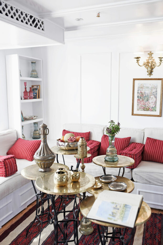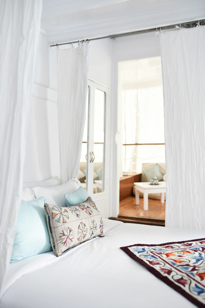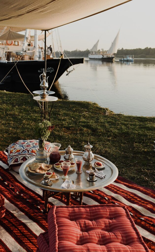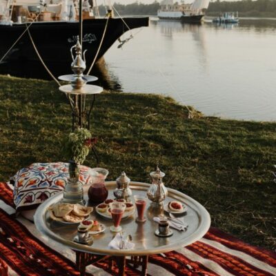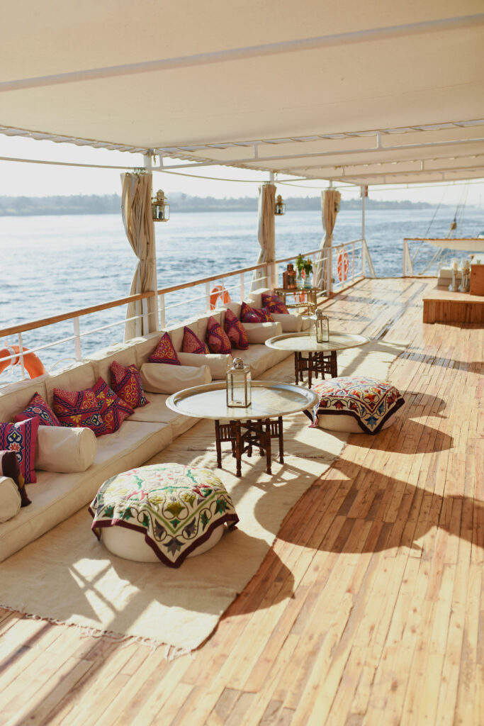 Bienheureux est celui qui assistera au lever de Râ ! Tel est le credo de Lazuli Nile Cruises qui propose des croisières romantiques à bord d’une dahabieh, un navire fluvial à faire tirant d’eau, doté de voiles latines et capable de naviguer sur le Nil en toutes saisons. Et c’est avec émotion que l’on grimpe à bord de ce bateau traditionnel sur lequel naviguaient les préfets de l’Égypte romaine, les pachas ottomans, les têtes couronnées d’Europe et les archéologues dont les croquis révélèrent les beautés du pays des pharaons. Loin de la foule des bateaux de croisière low-coast, on retrouve les couleurs des aquarelles de David Roberts, l’élégance romantique des premiers voyages de Thomas Cook. Meublé dans un style oriental raffiné, le navire ne peut en effet accueillir qu’une dizaine de personnes. D’Esna à Assouan, durant cinq jours d’une croisière à la Agatha Christie, on remonte le cours du Nil et du temps, avec des expériences exclusives comme un petit-déjeuner sur un îlot, un dîner aux chandelles sur la rive et bien sûr, des visites de sites historiques, mais en dehors des heures de grandes affluences.