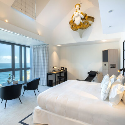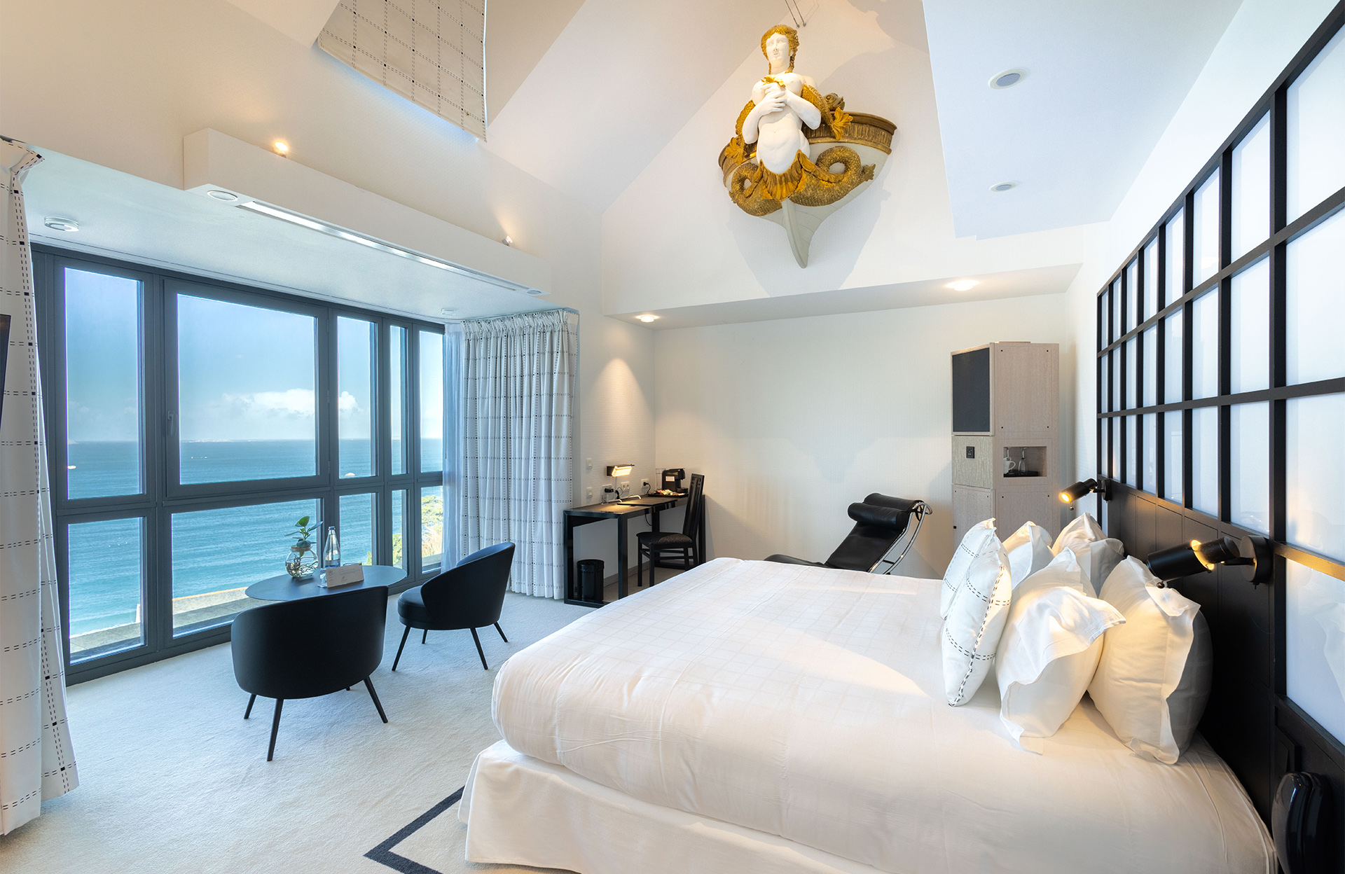 Suspendu entre ciel et mer, cet hôtel de luxe de Bretagne cultive un art de vivre singulier face à l’archipel des Sept Îles. À quelques pas de la plage de Trestraou, cet hôtel-spa 5 étoiles mêle élégance contemporaine, héritage Art déco et vues à couper le souffle. Verre, granit et acier dessinent une architecture pensée pour s’effacer devant le paysage. À l’intérieur, noir et blanc dominent avec justesse, entre lignes graphiques et détails zen. Les 45 chambres et suites réparties entre le bâtiment principal et deux villas (La Désirade et Eden Roc) offrent, selon l’orientation, panorama sur la mer ou quiétude côté jardin. Mention spéciale pour la suite Altitude, nichée sous les toits avec vue plongeante sur l’horizon. Côté table, le Bélouga déroule une partition créative et voyageuse, orchestrée par le chef Steve Carda, entre cuisine française racée et clins d’œil aux saveurs du monde. Le bar, chaleureux et feutré, se prolonge en terrasse panoramique, pour siroter un cocktail ou partager quelques tapas maison face aux flots. Le spa de 400 m² invite quant à lui à une déconnexion totale : piscine intérieure, jacuzzi, hammam, soins sur-mesure signés Codage… sans oublier l’espace Ukiyo, pensé comme une bulle suspendue. Une adresse raffinée, idéale pour savourer la Côte de Granit Rose dans sa version la plus apaisante.